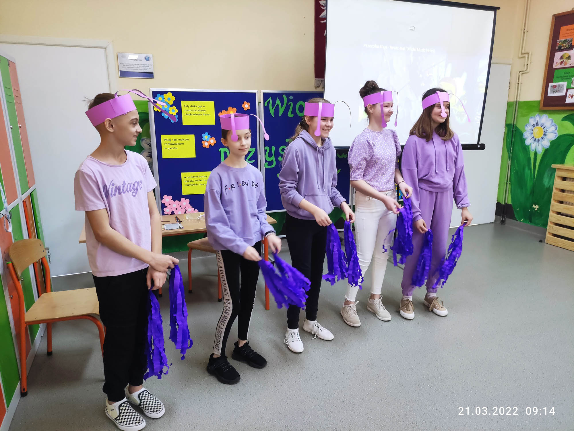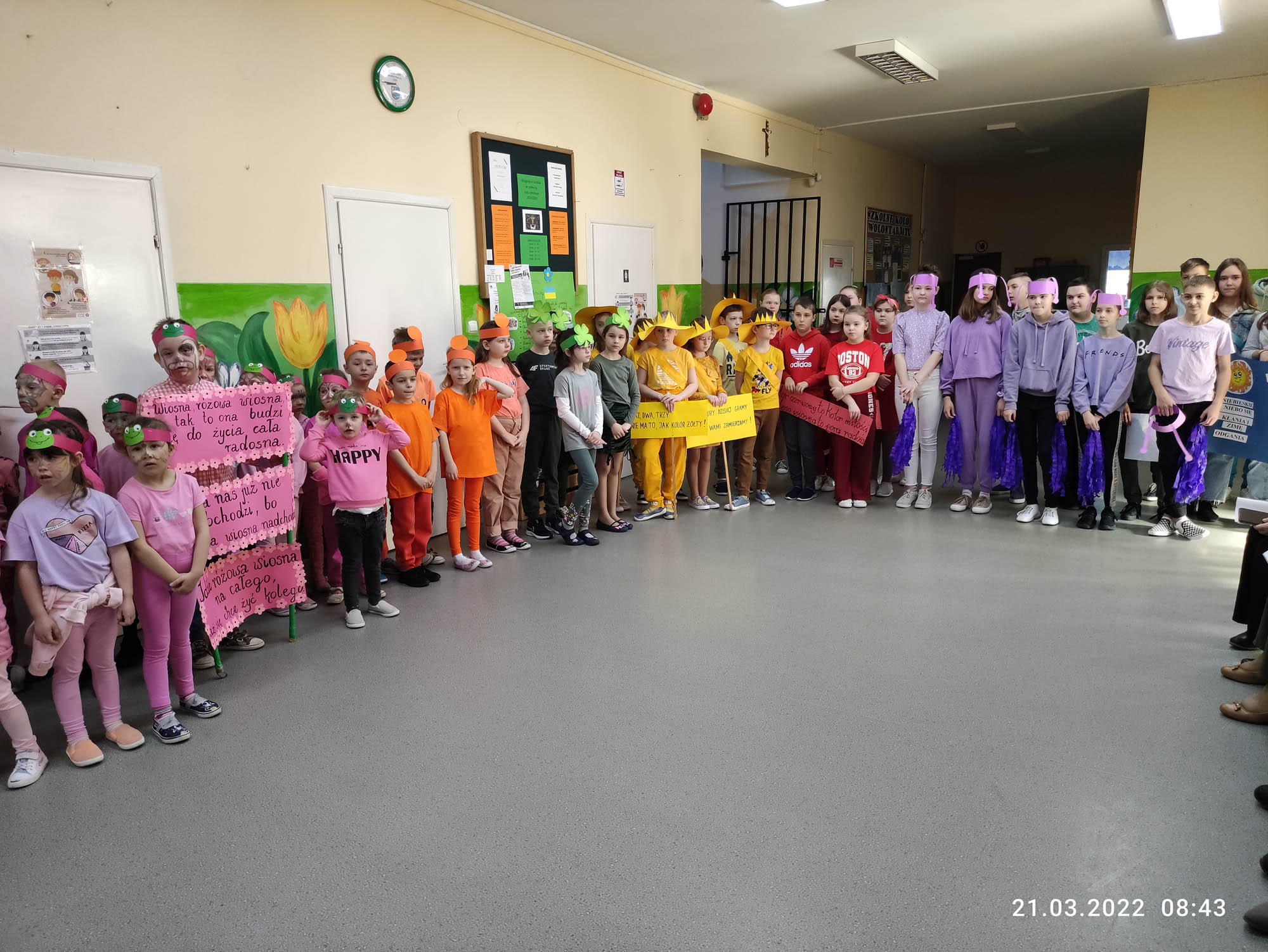 W poniedziałek 21 marca obchodziliśmy w naszej szkole Pierwszy Dzień Wiosny. Dzień ten przebiegał pod znakiem kolorów. Uczniowie każdej klasy wraz z wychowawcą przyszli tego dnia ubrani na wylosowany wcześniej kolor. Na korytarzu szkolnym od rana było więc wesoło i kolorowo.