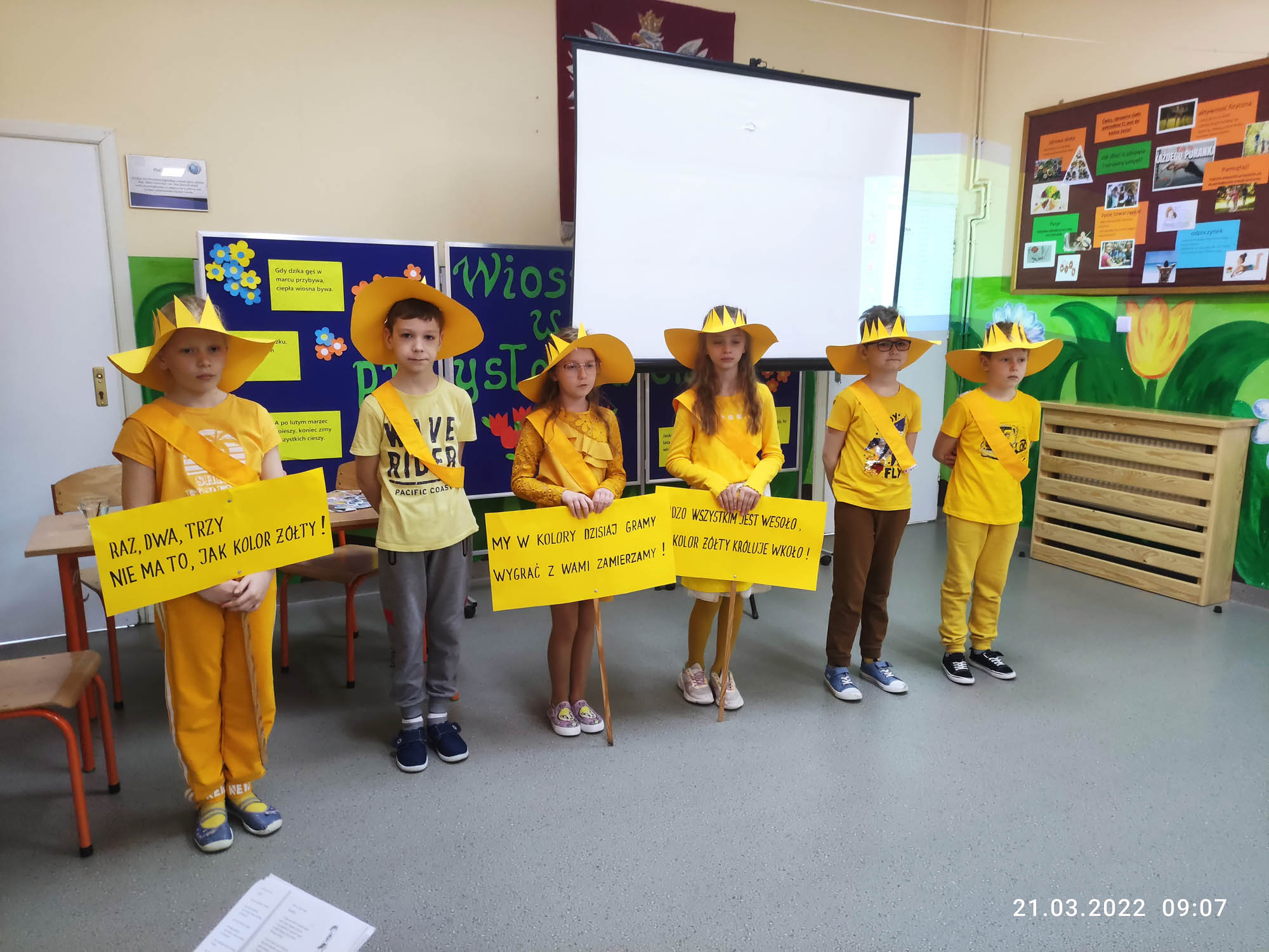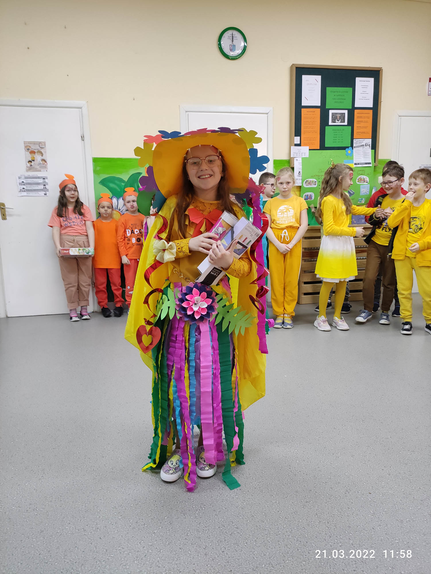 Punktem kulminacyjnym było przygotowanie przez uczniów klas 0-III przebrania Pani Wiosny, można było tylko wykorzystać otrzymane materiały, wśród których znalazły się: folia aluminiowa, worki na śmieci, bibuła, kolorowy papier, wstążeczki, folia spożywcza, słomki. Uczniowie wraz z wychowawcami wykazali się dużą kreatywnością, wszystkie Wiosenki były ubrane bardzo ciekawie i kolorowo. Natomiast zadaniem klas IV-VIII było przygotowanie plakatów wiosennych z nawiązaniem do prezentowanego koloru. Prace uczniów można oglądać na dolnym korytarzu. Wszyscy uczniowie za swoją pracę i zaangażowanie zostali nagrodzeni.