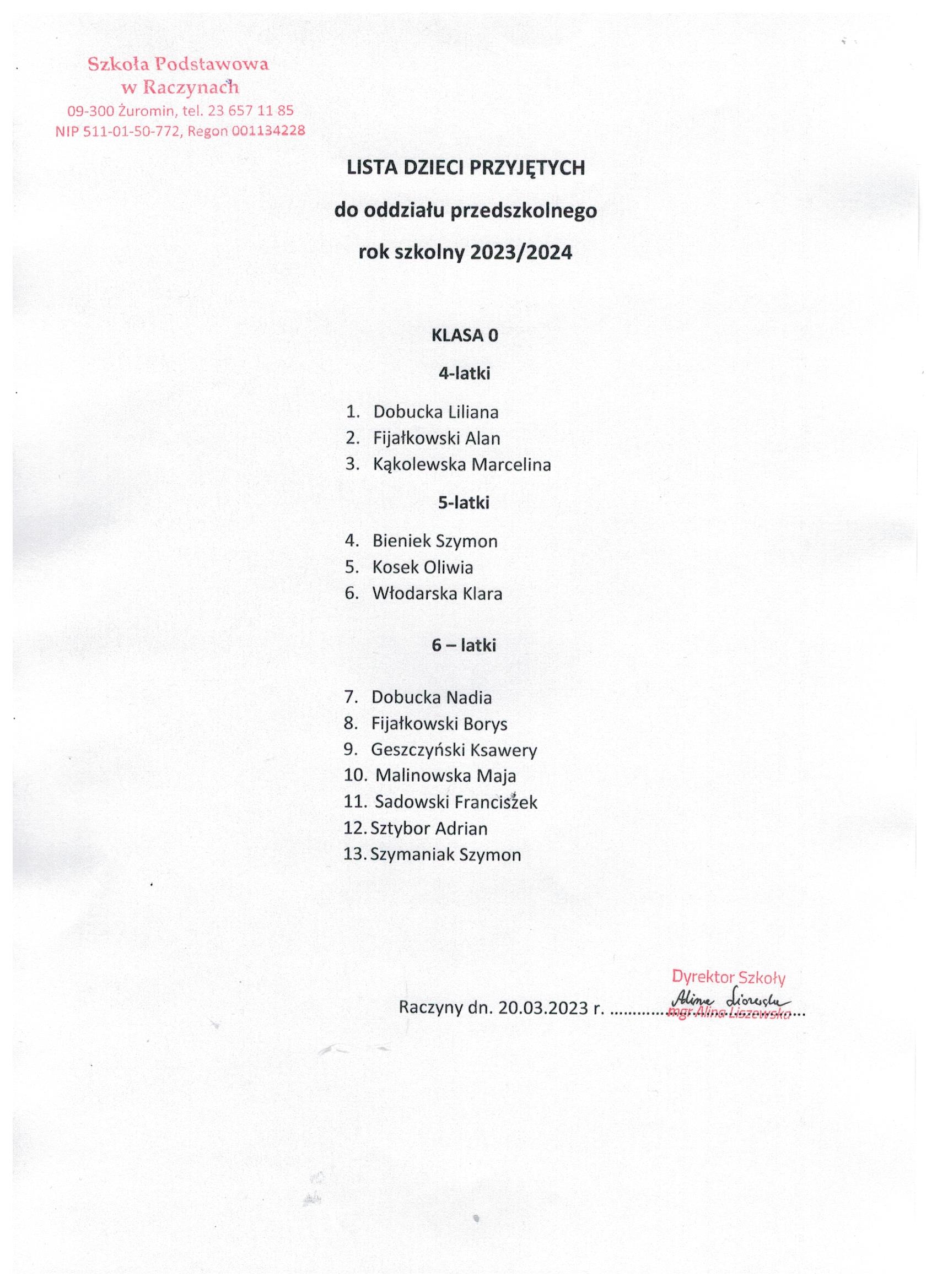 Lista uczniów przyjętych do klasy I i oddziału przedszkolnego w roku szkolnym 2023/2024