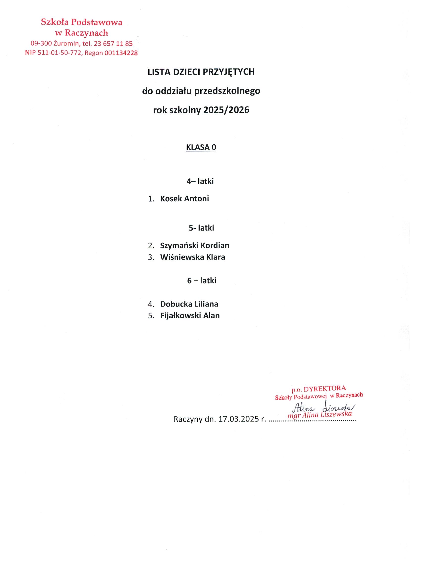 Lista uczniów przyjętych do klas 1 i do oddziału przedszkolnego