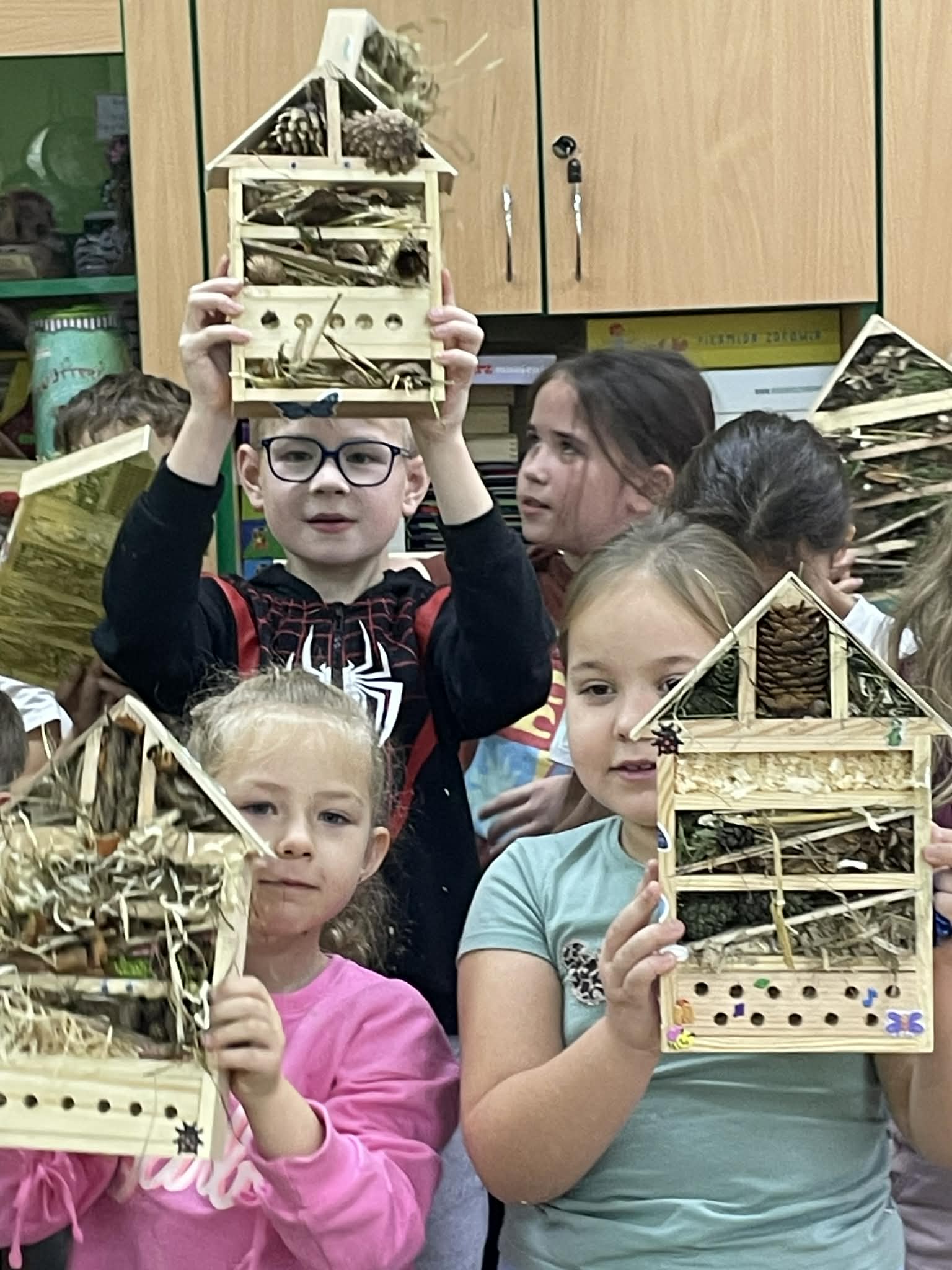 Dzieci miały okazję poznać znaczenie owadów w przyrodzie, a następnie – pod okiem prowadzącej – samodzielnie tworzyć drewniane domki, które trafią do prywatnych ogrodów naszych uczniów..