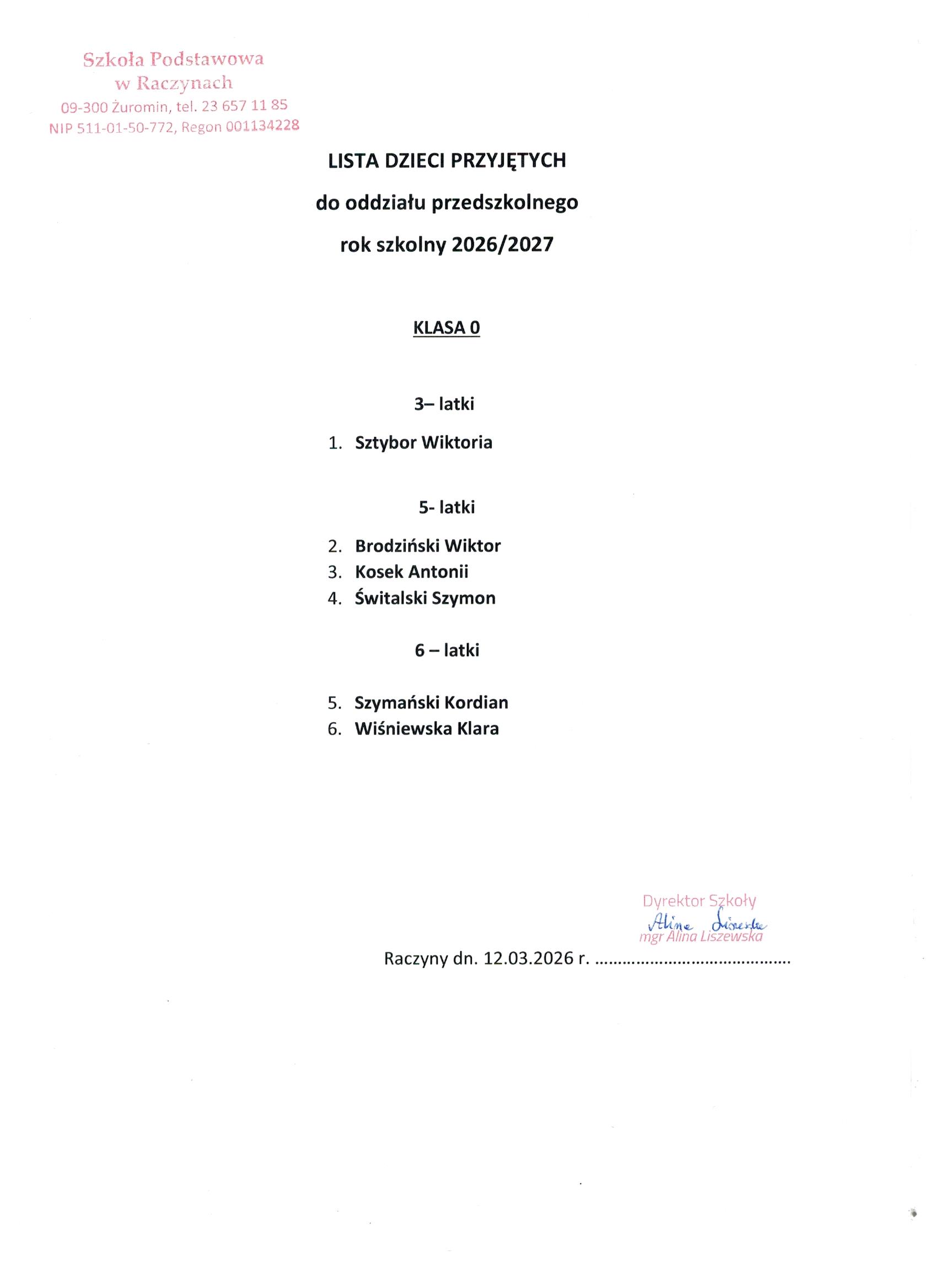 Lista dzieci przyjętych do oddziału przedszkolnego w roku szkilnym 2026/27