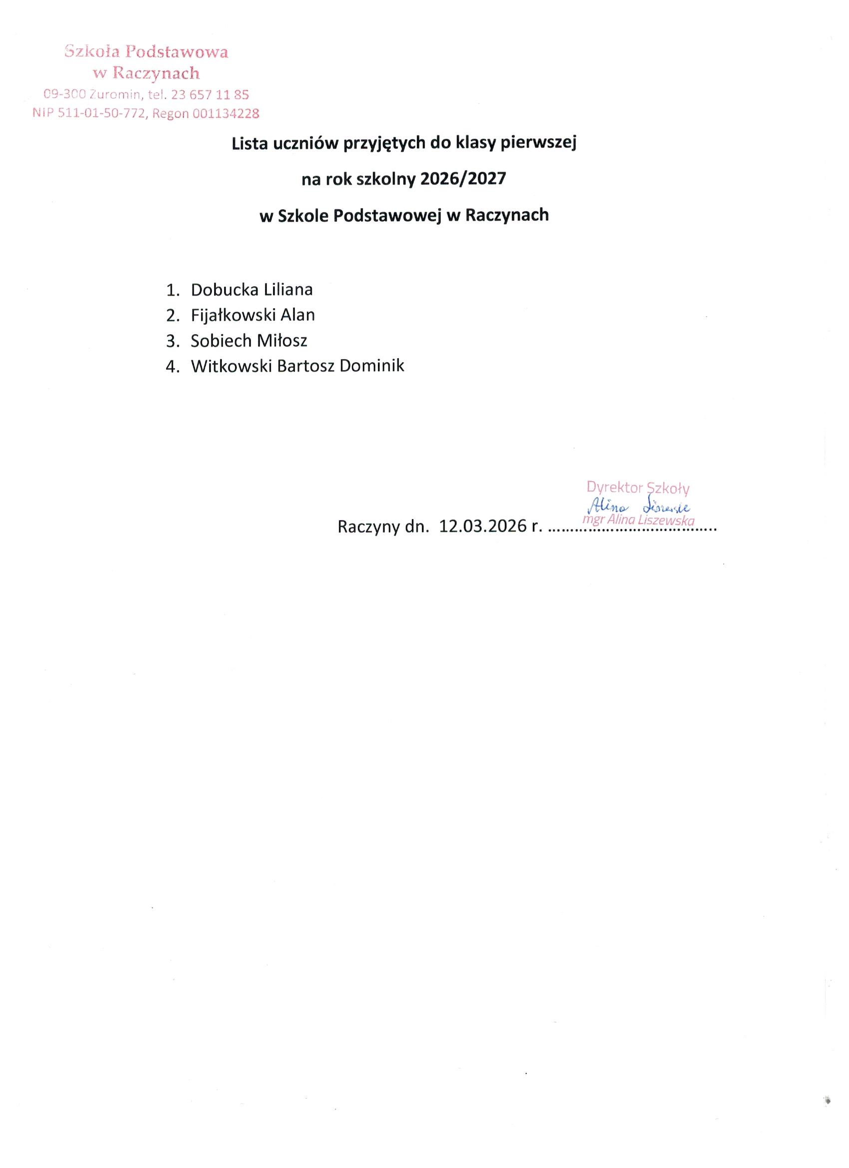 Lista uczniów przyjętych do klasy pierwszej w roku szkolnym 2026/27