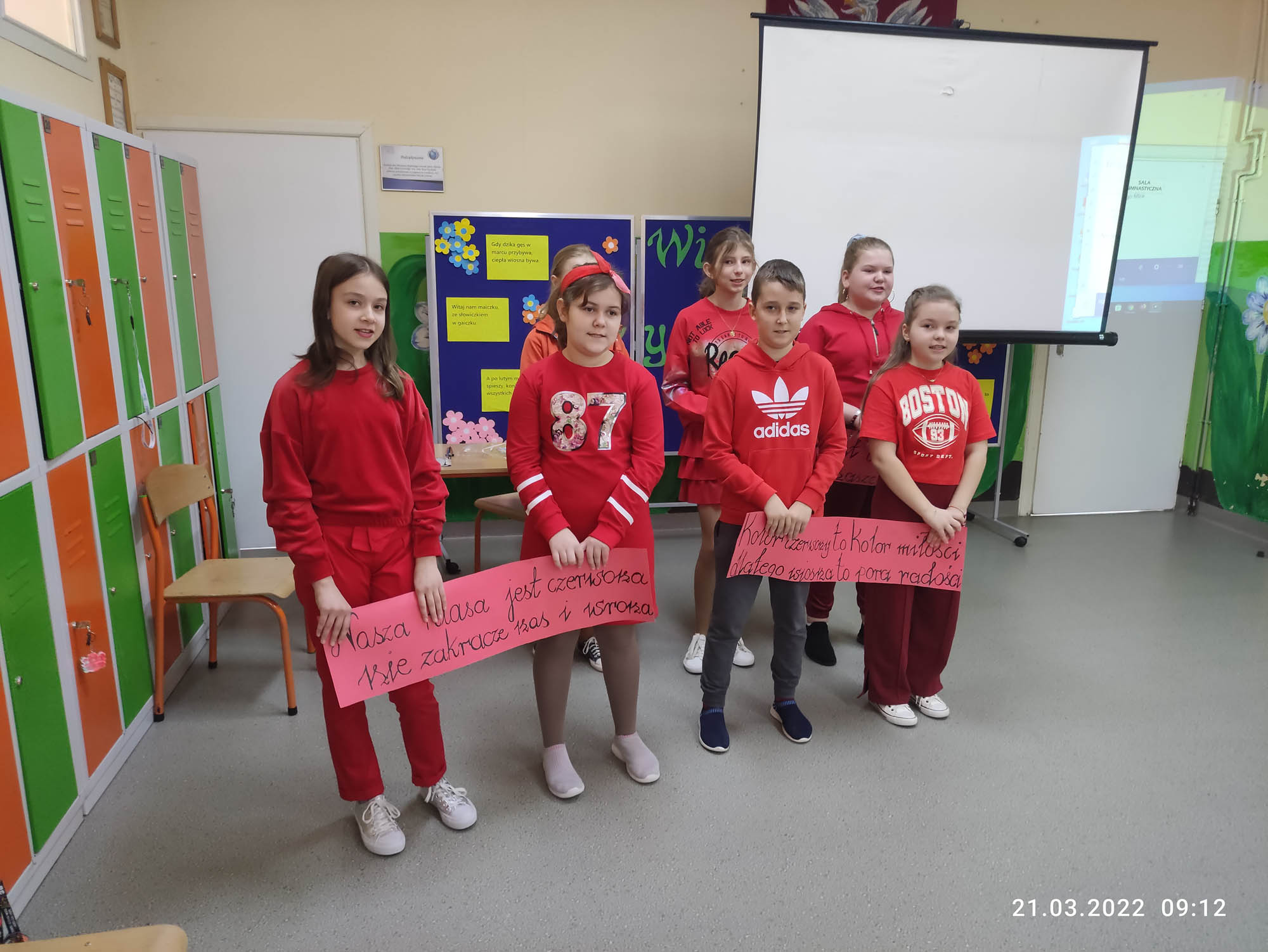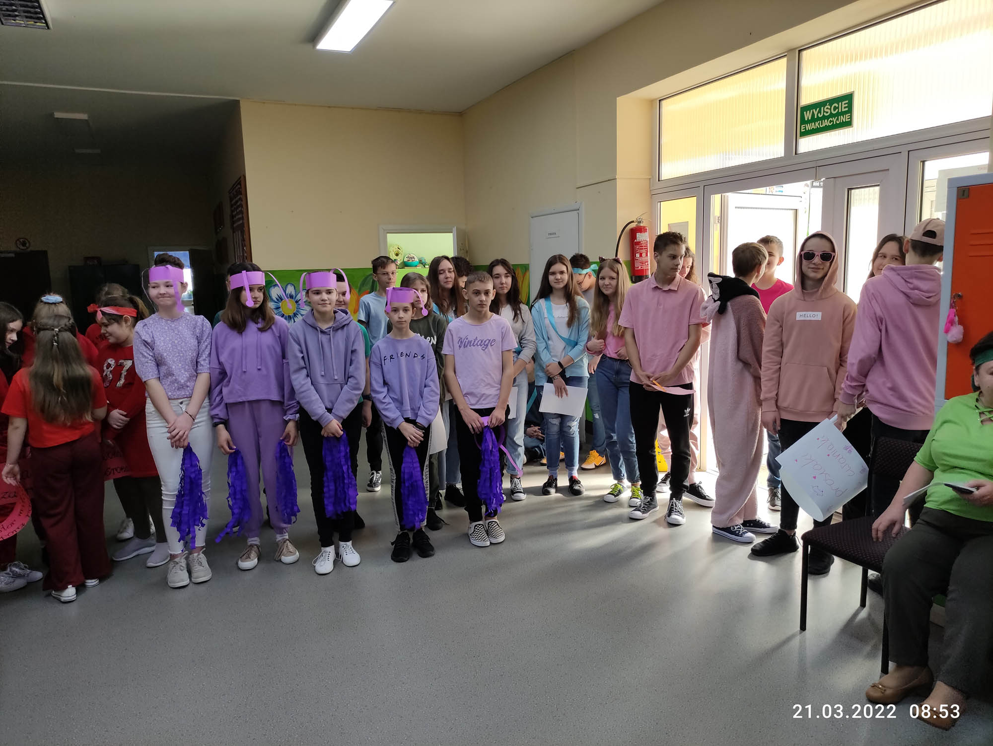 W poniedziałek 21 marca obchodziliśmy w naszej szkole Pierwszy Dzień Wiosny. Dzień ten przebiegał pod znakiem kolorów. Uczniowie każdej klasy wraz z wychowawcą przyszli tego dnia ubrani na wylosowany wcześniej kolor. Na korytarzu szkolnym od rana było więc wesoło i kolorowo.
