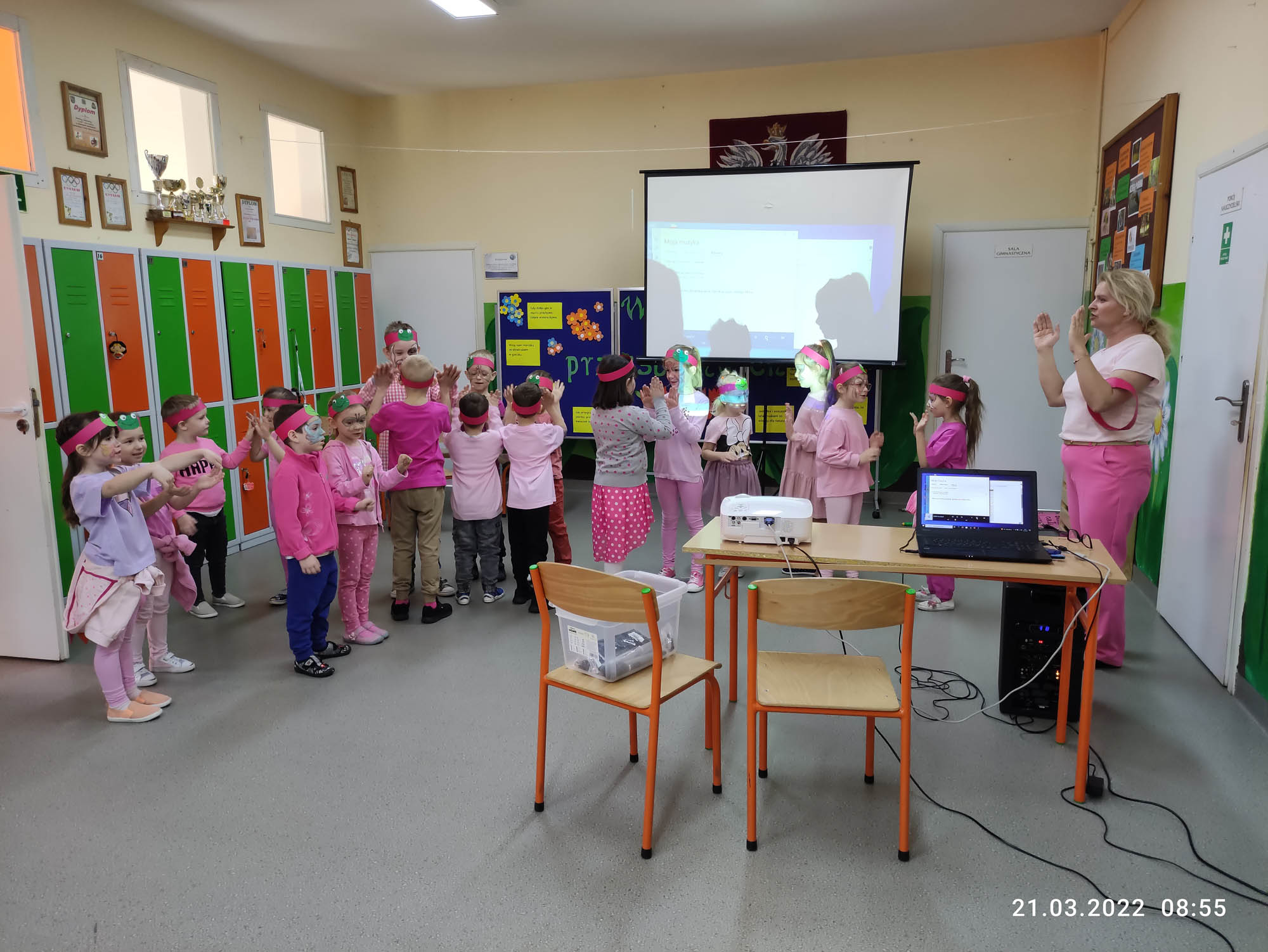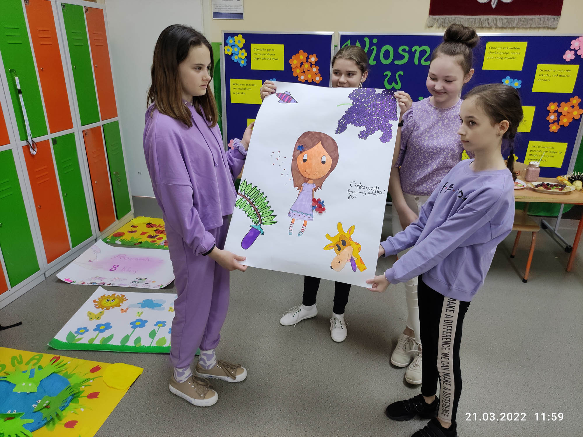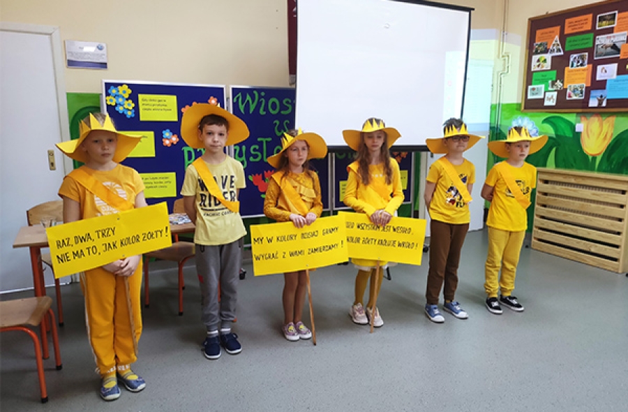 Punktem kulminacyjnym było przygotowanie przez uczniów klas 0-III przebrania Pani Wiosny, można było tylko wykorzystać otrzymane materiały, wśród których znalazły się: folia aluminiowa, worki na śmieci, bibuła, kolorowy papier, wstążeczki, folia spożywcza, słomki. Uczniowie wraz z wychowawcami wykazali się dużą kreatywnością, wszystkie Wiosenki były ubrane bardzo ciekawie i kolorowo. Natomiast zadaniem klas IV-VIII było przygotowanie plakatów wiosennych z nawiązaniem do prezentowanego koloru. Prace uczniów można oglądać na dolnym korytarzu. Wszyscy uczniowie za swoją pracę i zaangażowanie zostali nagrodzeni.