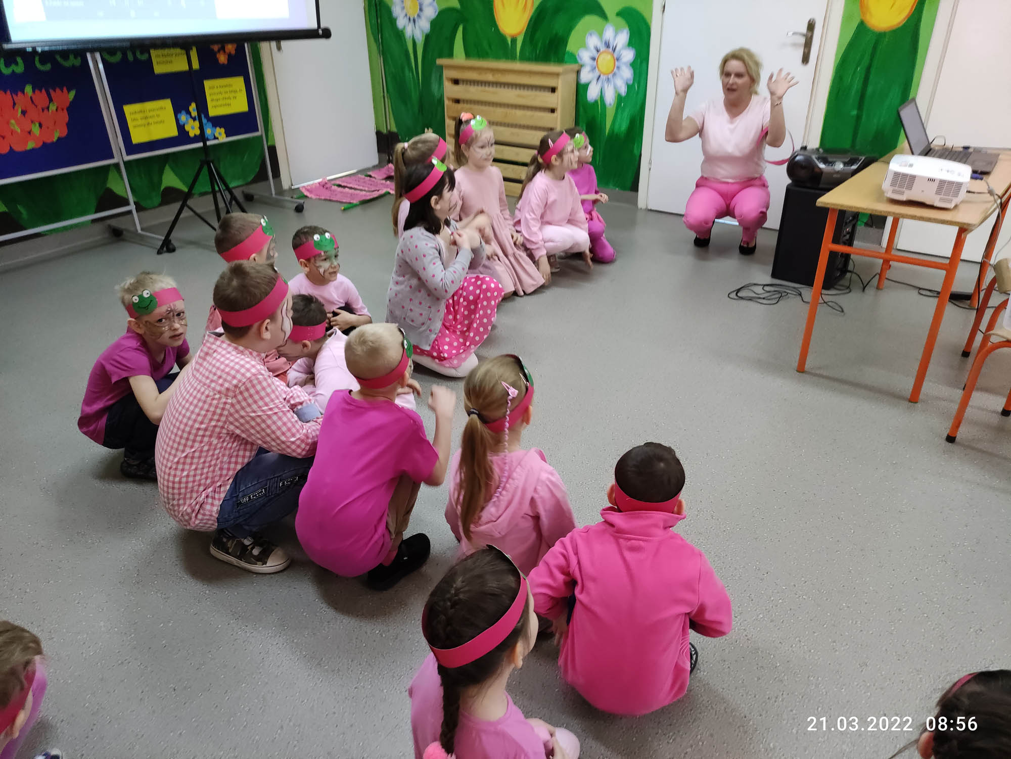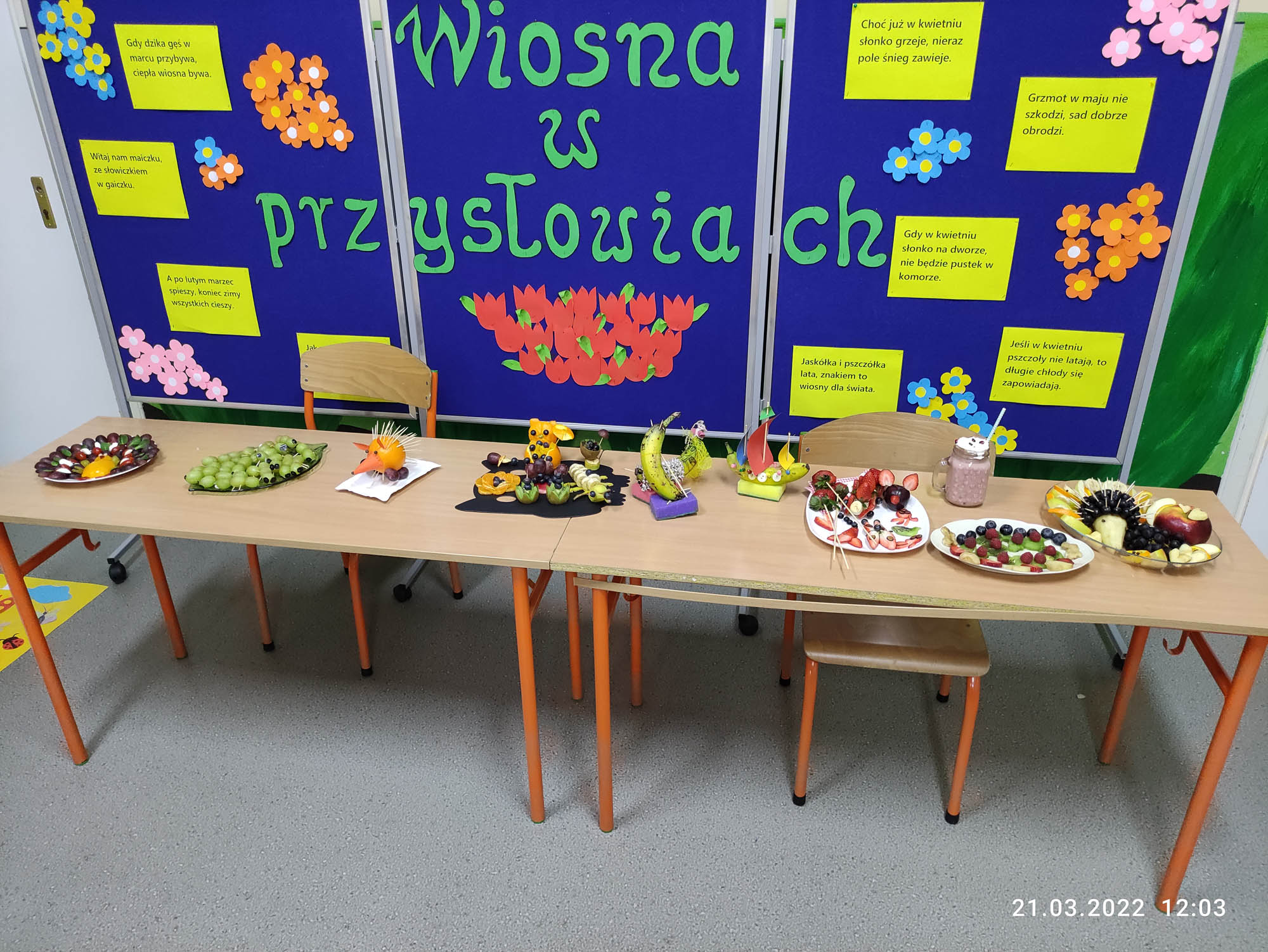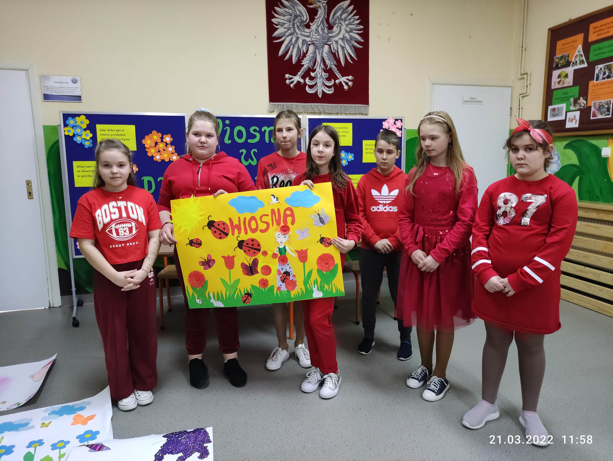 Punktem kulminacyjnym było przygotowanie przez uczniów klas 0-III przebrania Pani Wiosny, można było tylko wykorzystać otrzymane materiały, wśród których znalazły się: folia aluminiowa, worki na śmieci, bibuła, kolorowy papier, wstążeczki, folia spożywcza, słomki. Uczniowie wraz z wychowawcami wykazali się dużą kreatywnością, wszystkie Wiosenki były ubrane bardzo ciekawie i kolorowo. Natomiast zadaniem klas IV-VIII było przygotowanie plakatów wiosennych z nawiązaniem do prezentowanego koloru. Prace uczniów można oglądać na dolnym korytarzu. Wszyscy uczniowie za swoją pracę i zaangażowanie zostali nagrodzeni.