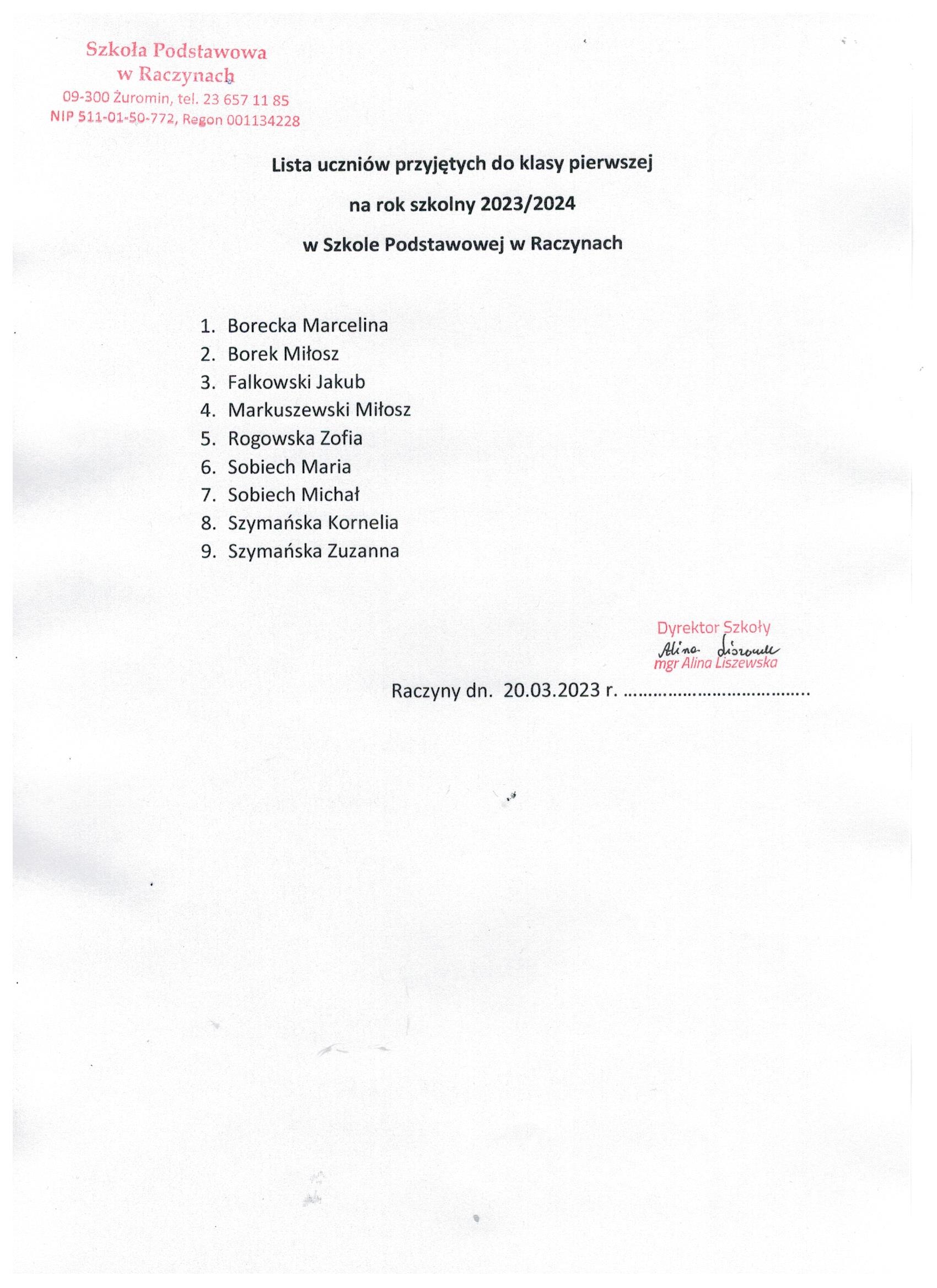Lista uczniów przyjętych do klasy I i oddziału przedszkolnego w roku szkolnym 2023/2024