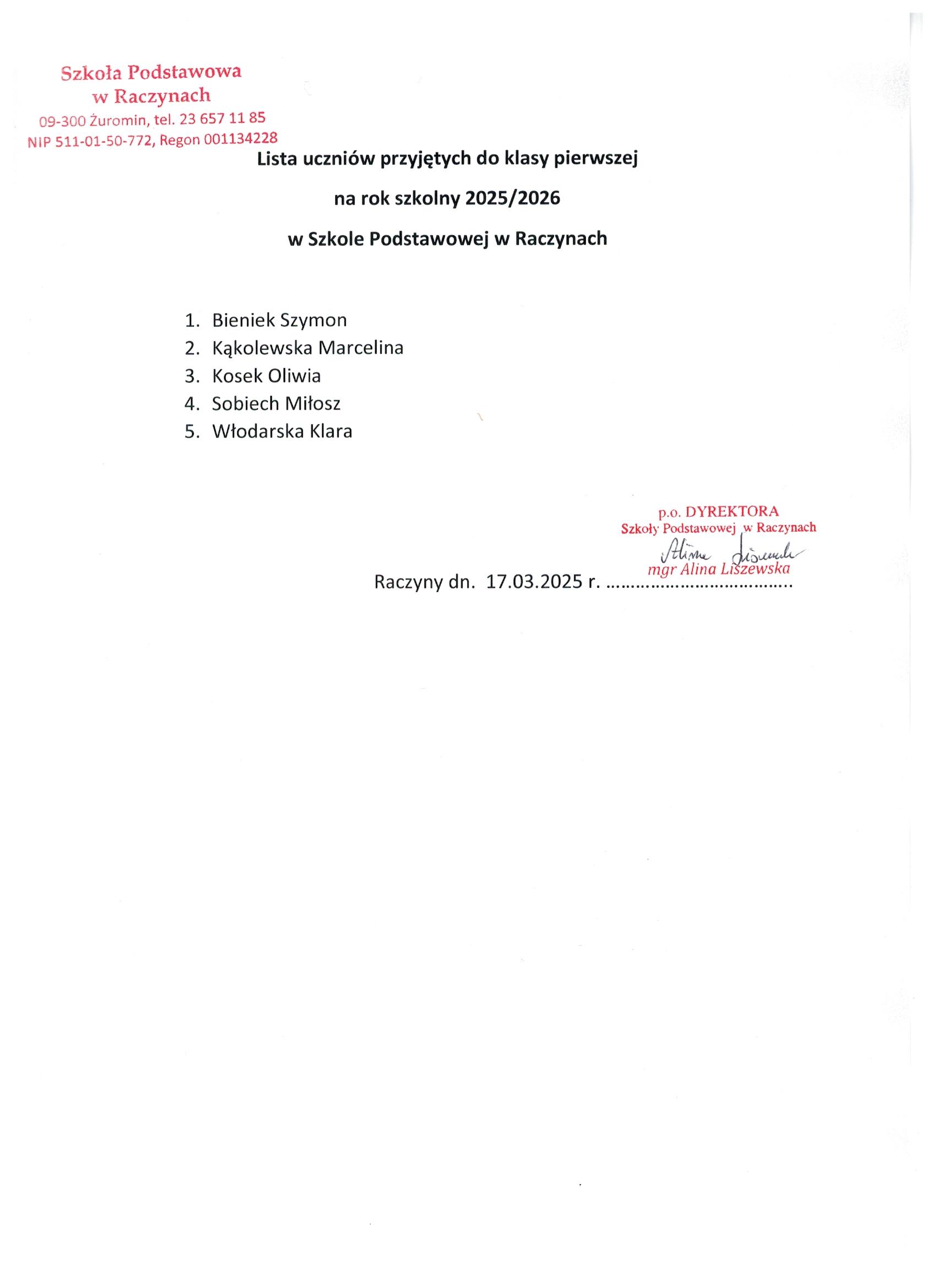 Lista uczniów przyjętych do klas 1 i do oddziału przedszkolnego