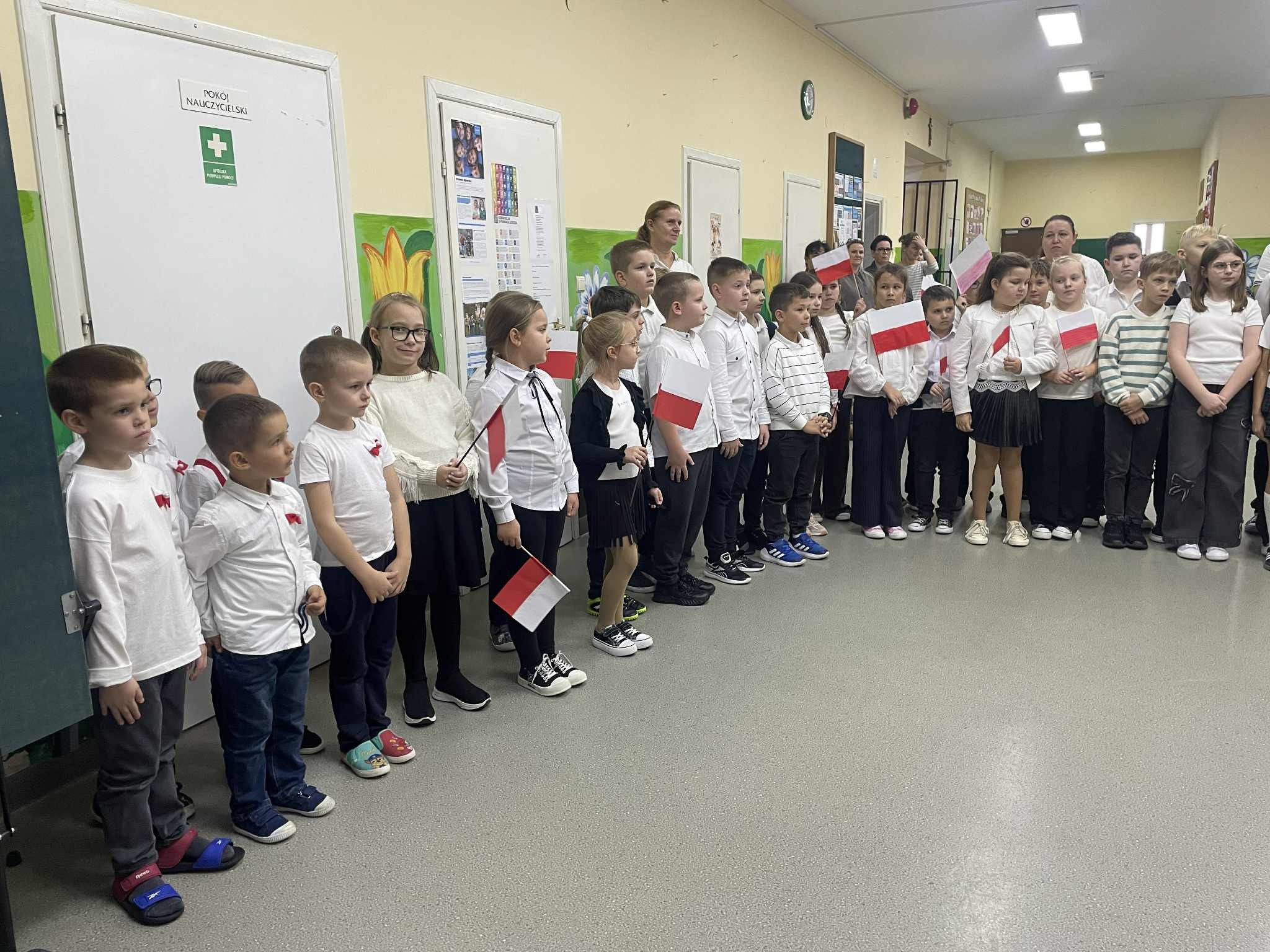 Tego dnia w naszej szkole panowała wyjątkowa, patriotyczna atmosfera. Uczniowie przyszli ubrani w stroje w barwach – biało-czarnych, a sale i korytarze ozdobione były biało-czerwonymi dekoracjami.